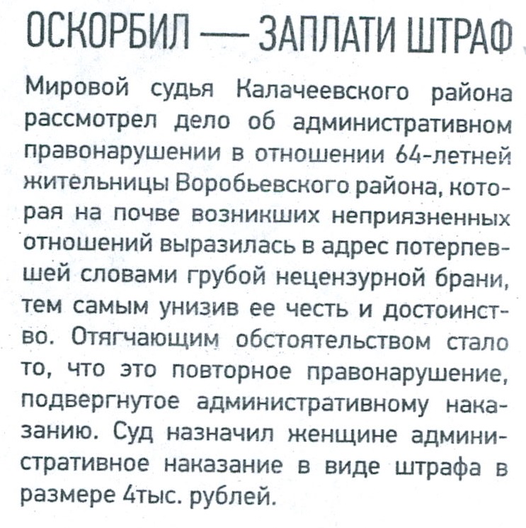| Статья в газете "Восход" от 21.02.2025 № 7 "Оскорбил - заплати штраф" | версия для печати |