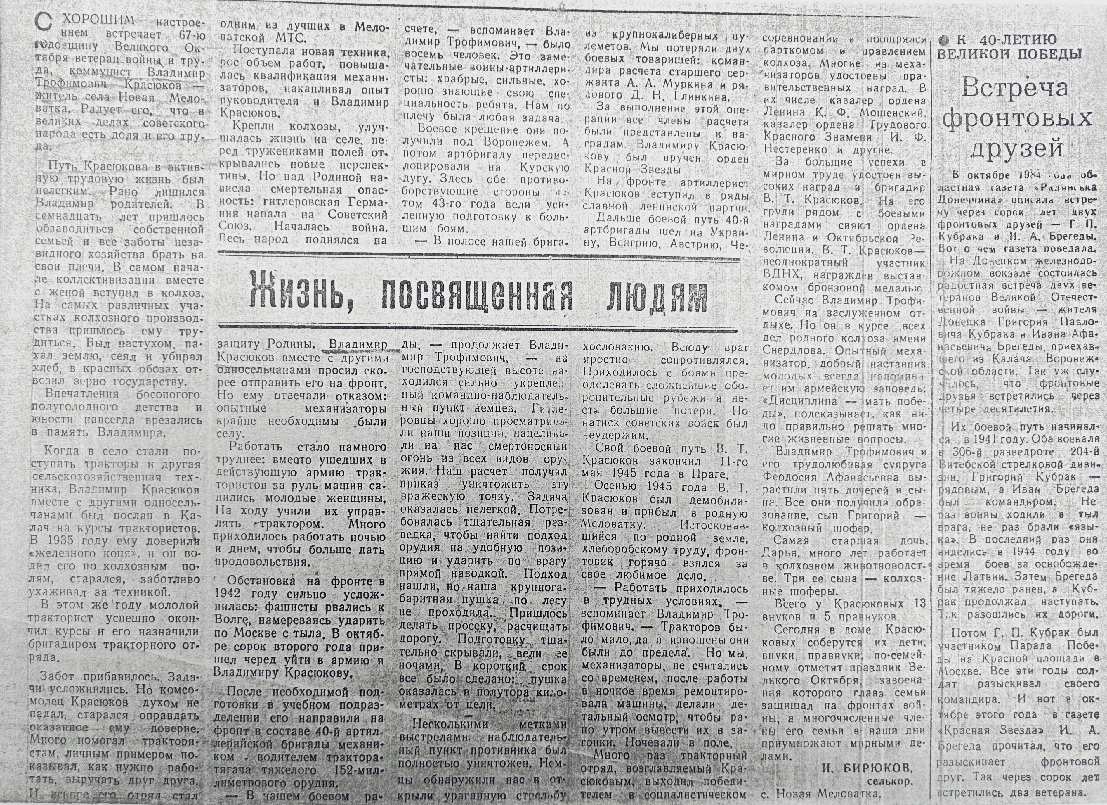 В честь 80-й годовщины Победы в Великой Отечественной войне в Калачеевском районном суде Воронежской области проводится онлайн-акция «Бессмертный полк». Судьи и работники суда делятся данными из своих семейных архивов. Дедушка водителя автомобиля суда Красюкова Виталия Григорьевича, Красюков Владимир Трофимович ушел на фронт в октябре 1942 года и был отправлен в состав 40-й артиллерийской бригады механиком-водителем трактора-тягача тяжелого 152 миллиметрового орудия. В расчете было 8 человек – воинов артиллеристов. Боевое крещение они получили под Воронежем. В то время Воронеж держал оборону 212 дней. А потом артбригаду передислоцировали на курскую дугу. За успешное выполнение важных боевых операций все члены расчета были представлены к наградам. Владимиру Трофимовичу Красюкову был вручен орден Красной Звезды. Боевой путь 40-й артбригады шел на Украину, Венгрию, Австрию, Чехословакию. Всюду враг яростно сопротивлялся. Но натиск советских войск был неудержим. Свой боевой путь Красюков Владимир Трофимович закончил 11 мая 1945 года в Праге. Осенью 1945 года Красюков В.Т. был демобилизован и прибыл в родное село Меловатка Калачеевского района. ![]() |