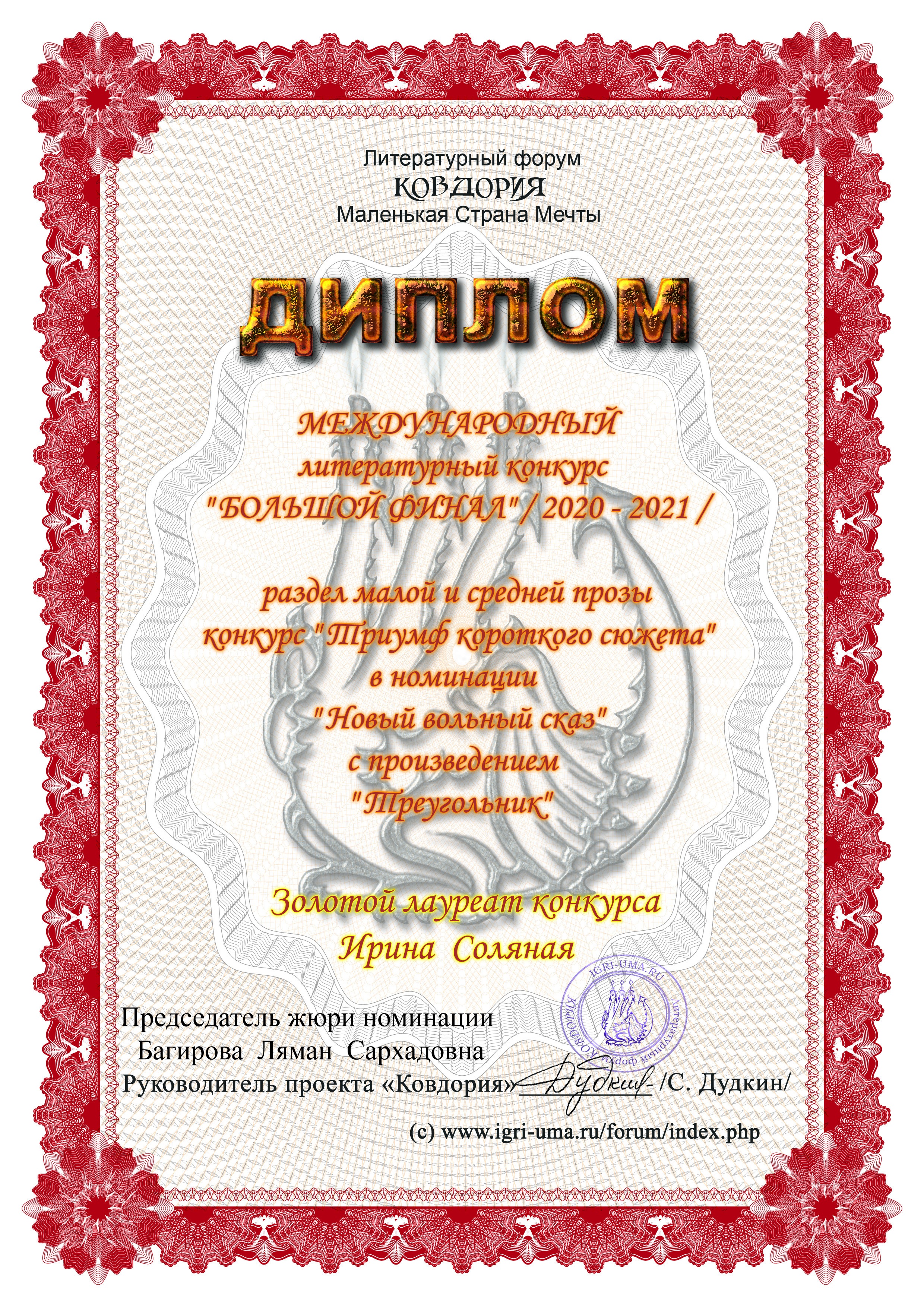 | В канун празднования 80-й годовщины Победы в Великой Отечественной войне представляем Вашему вниманию произведение судьи Калачеевского районного суда Воронежской области Соляной Ирины Владимировны о Великой Отечественной войне - «Треугольник». Ирина Владимировна Соляная награждена дипломом золотого лауреата Международного литературного конкурса «Большой финал» раздела малой и средней прозы конкурса «Триумф короткого сюжета» в номинации «Новый вольный сказ» с произведением «Треугольник». Пенсионерка Людмила Михайловна Мельникова отдала школе тридцать лет. Из них двадцать проработала завучем. Ученики запомнили её упрямый рот с тонкими губами, всегда плотно сжатыми, прямой пробор в седой причёске, слегка оттопыренные уши, которые она прятала под прядями прилизанных волос. Взгляд строгий, иногда с ехидцей. Сергей Николаевич Карпов сразу её узнал, хотя и давненько не видел. В старших классах ему туго давалась химия, особенно задачи. Людмила Михайловна преподносила материал чётко и скрупулёзно, но также дотошно проверяла задачи на расчёт масс веществ, получаемых в результате химических реакций. И всегда у Серёжки Карпова были ошибки в расчётах. И вот теперь, старая женщина стояла перед ним, военкомом, теребя в руках беленький носовой платок. А он вместо того, чтобы приосаниться и начальственным голосом спросить у неё, зачем, дескать, старушка, беспокоишь важного человека, вспоминал свои двойки и редкие тройки по химии. Откашлявшись, он поздоровался. — Здравствуй, товарищ Серёжа, — по школьной своей привычке сказала Людмила Михайловна, - ты удивишься, с каким я вопросом к тебе. Сергей Николаевич привык на своей должности к любым вопросам, поэтому его было сложно чем-то удивить. — Я вас внимательно слушаю. — Дочка моя, которая в Москве живёт, на сайте «Подвиг народа» сведения нашла о моём отце. О Степане Порфирьевиче Степнове. Там написано... — Постойте, Людмила Михайловна, - невежливо перебил её товарищ Серёжа, — как же об отце Степане, если вы по отчеству Михайловна? — Да, так и есть. Отец у меня Степан был. Он в войну пропал без вести, мать получила извещение. Мне было четыре года. После войны мать вышла замуж за Михаила Никаноровича, а уж потом, когда мне было шестнадцать лет, отчим меня удочерил. — Что ж ждал долго? — спросил не к месту товарищ Серёжа. — Пенсию по потере кормильца получала мать на нас с братом. А потом сказала она, что мы живём неправильно. Вроде одной семьёй, а вроде и не одной. — А-а-а-... — протянул военком, начиная скучать. — Так вот, на сайте «Подвиг народа» написано, что мой отец был награждён званием Героя Советского Союза. А мы этого не знали, и вручения награды не было, и мы... —Людмила Михайловна всхлипнула, поднесла платочек к лицу, но вскоре оправилась и продолжила, — это же мой отец, я бы хотела этот орден получить. Не затерялся же он где-то? — Трудно сказать, — пожал плечами военком, — столько лет прошло... — Я тут распечатку с сайта сделала, мне соседка помогла. Может, пригодится? Там все совпадает: и имя, и отчество, и военкомат, с которого призывали. Только не пропал он без вести, погиб геройски. Сергей Николаевич вздохнул и сказал, что надо написать заявление, а он уже запрос сделает. Под диктовку бывшего ученика растерянная старуха написала заявление и ушла. Вечером за ужином «товарищ Серёжа» рассказал жен
