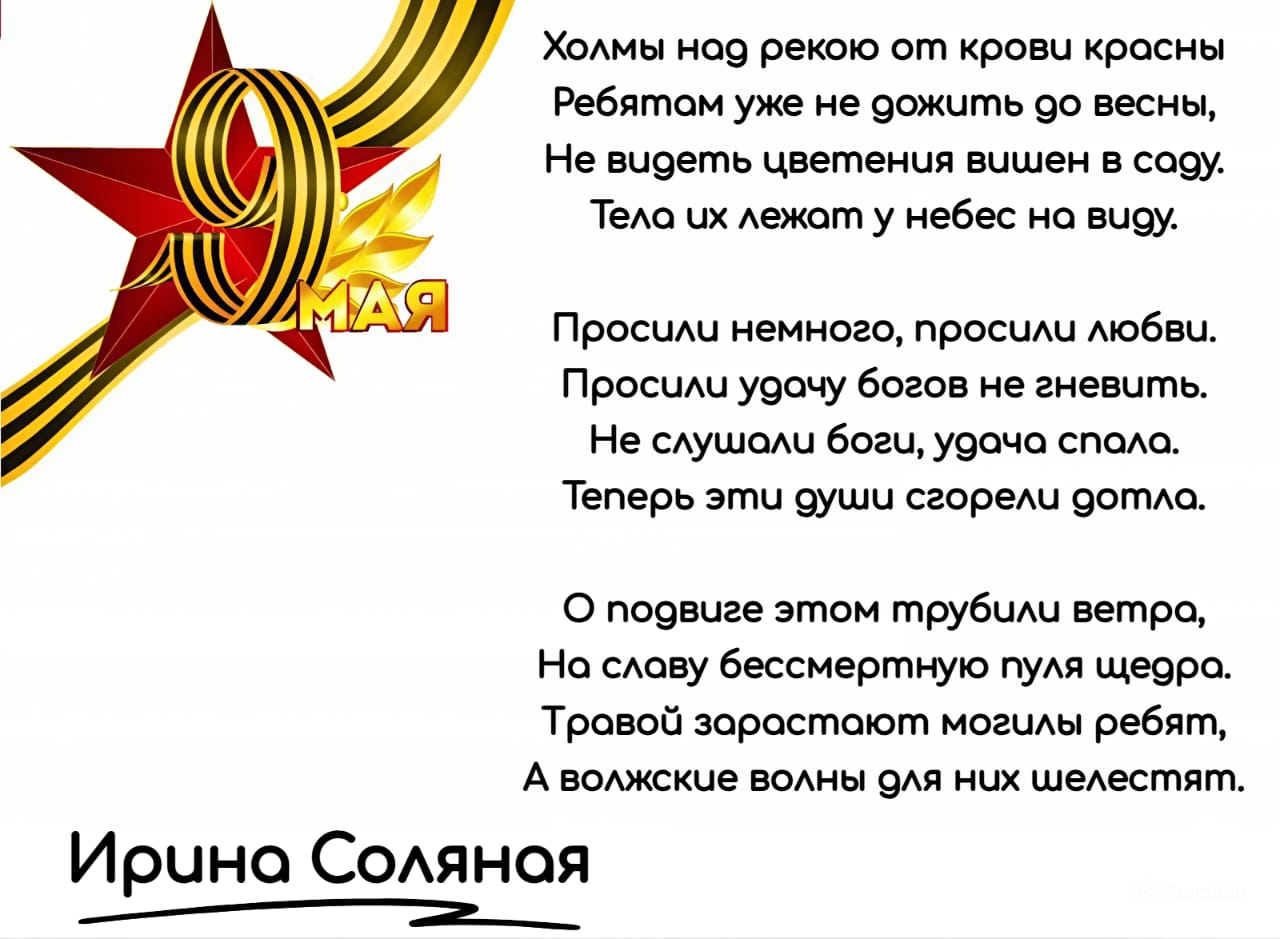 | Cтихотворения судьи Калачеевского районного суда Воронежской области Соляной Ирины Владимировны, посвященные Великой Отечественной Войне | версия для печати |