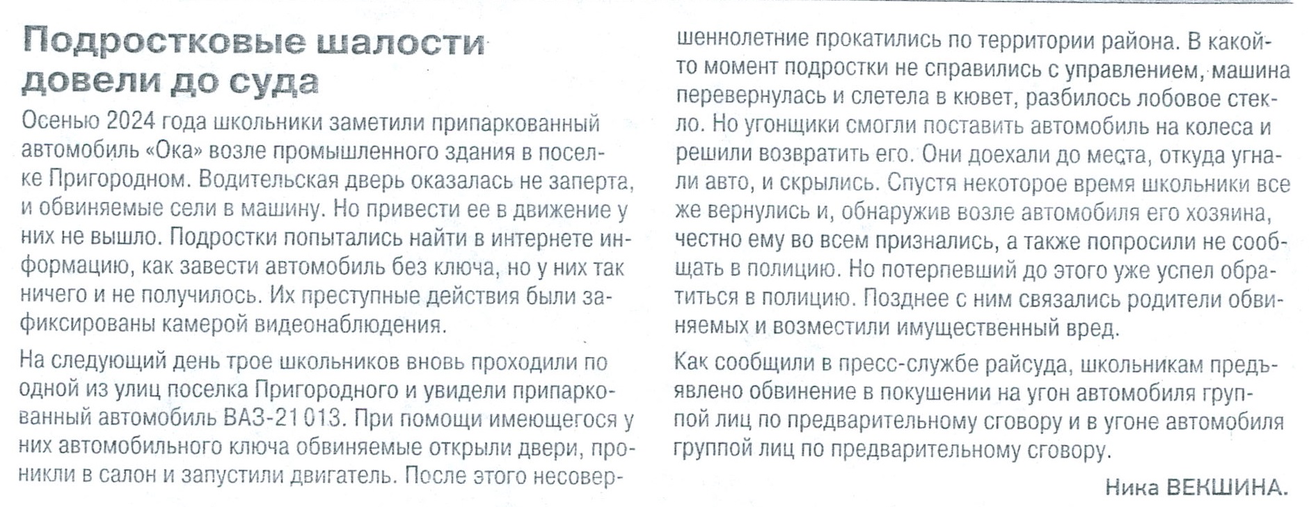 | Статья в газете "Калачеевские зори" от 31.01.2025 № 4 "Подростковые шалости довели до суда" | версия для печати |