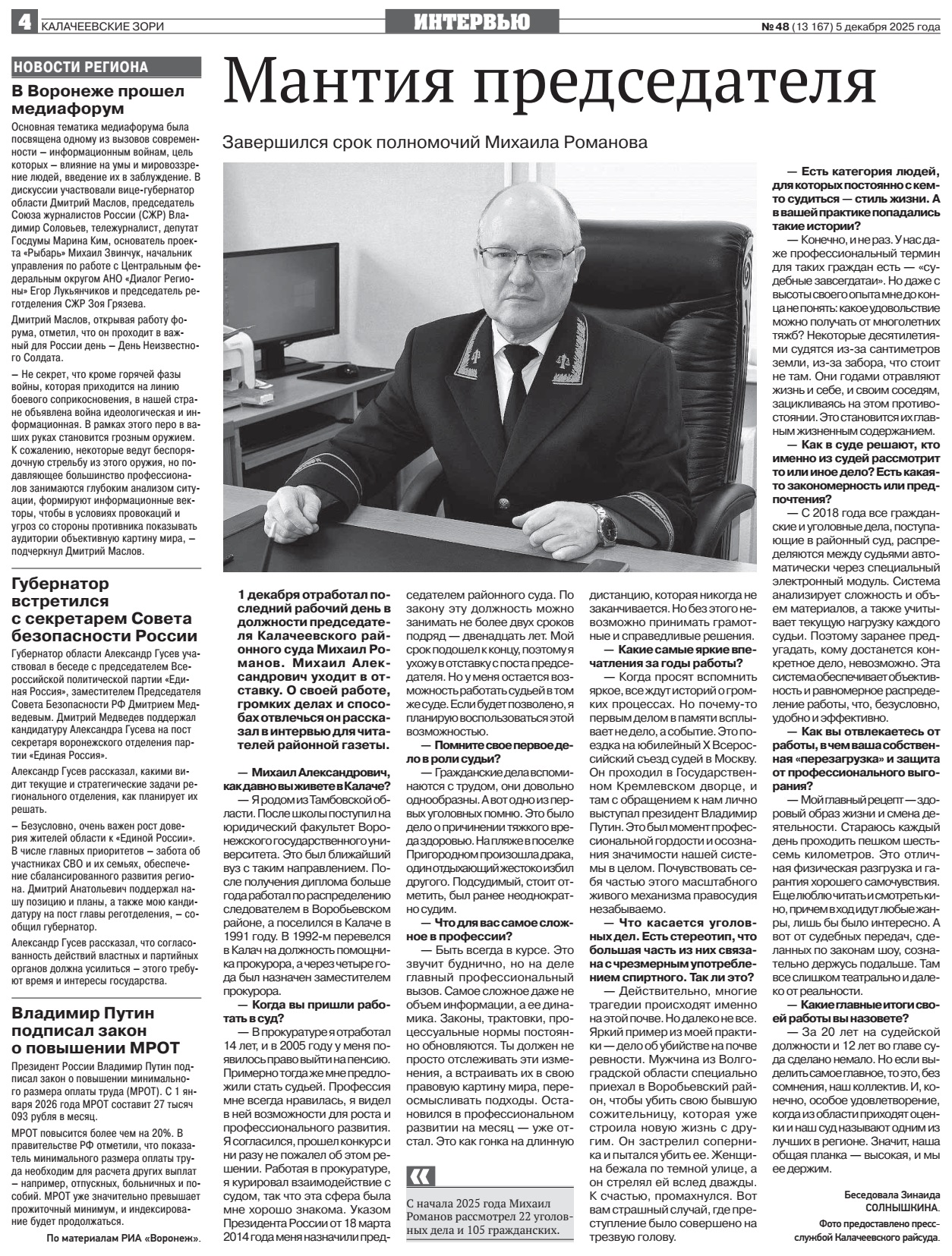 | В районной газете "Калачеевские зори" от 05.12.2025 № 48 опубликована статья "Мантия председателя. Завершился срок полномочий Михаила Романова" | версия для печати |