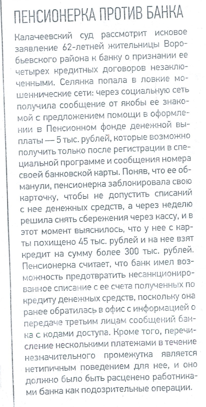 | Статья в газете "Восход" от 07.02.2025 № 5 "Пенсионерка против банка" | версия для печати |