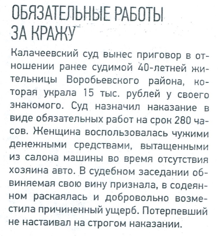 | Статья в газете "Восход" от 21.02.2025 № 7 "Обязательные работы за кражу" | версия для печати |